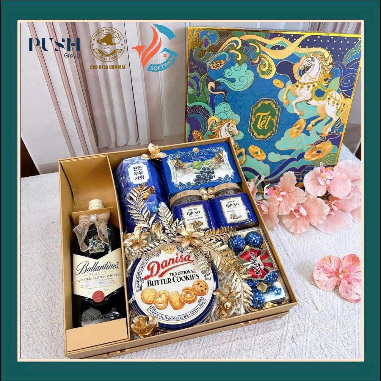 Sét quà Tết #A1302 nổi bật với whisky Ballantines Finest – biểu trưng cho bản lĩnh và thành công, kết hợp cùng các loại hạt, bánh kẹo nhập khẩu cao cấp. Set quà thể hiện đẳng cấp người tặng, là lựa chọn lý tưởng dành cho đối tác chiến lược và khách hàng VIP trong dịp Tết Bính Ngọ 2026.